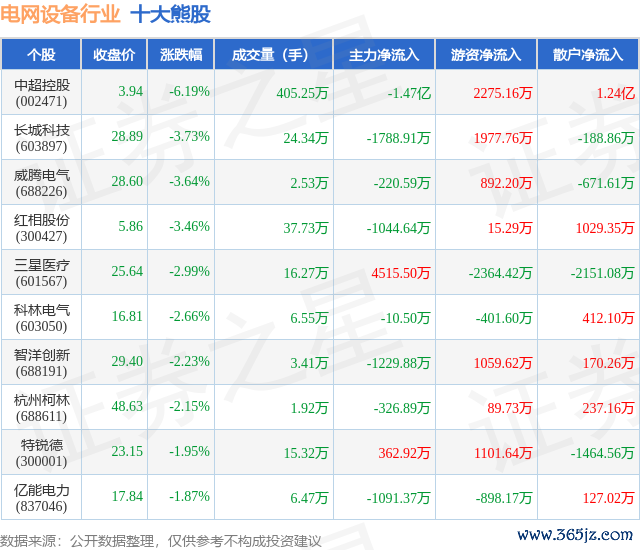 个股表现方面,电网设备行业当日领跌股为中超控股(002471),该股当日报收3.94,下跌6.19%,成交量405.25万,主力资金净流出1.47亿元。长城科技(603897)以下跌3.73%紧随其后,该股当日成交量24.34万,主力资金净流出1788.91万元。除此之外,威腾电气(688226)、红相股份(300427)、三星医疗(601567)均进入当日熊股之列。具体个股列表见下表: