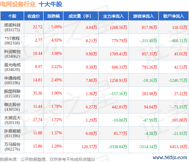 个股表现方面,电网设备行业当日领涨股为派诺科技(831175),该股当日报收22.72,上涨5.09%,成交量4.04万,主力资金净流入1268.5万元。*ST惠程(002168)以上涨4.92%紧随其后,该股当日成交量8.21万,主力资金净流入779.79万元。除此之外,科润智控(834062)、晨光电缆(834639)、华通线缆(605196)均进入当日牛股之列。具体个股列表见下表: