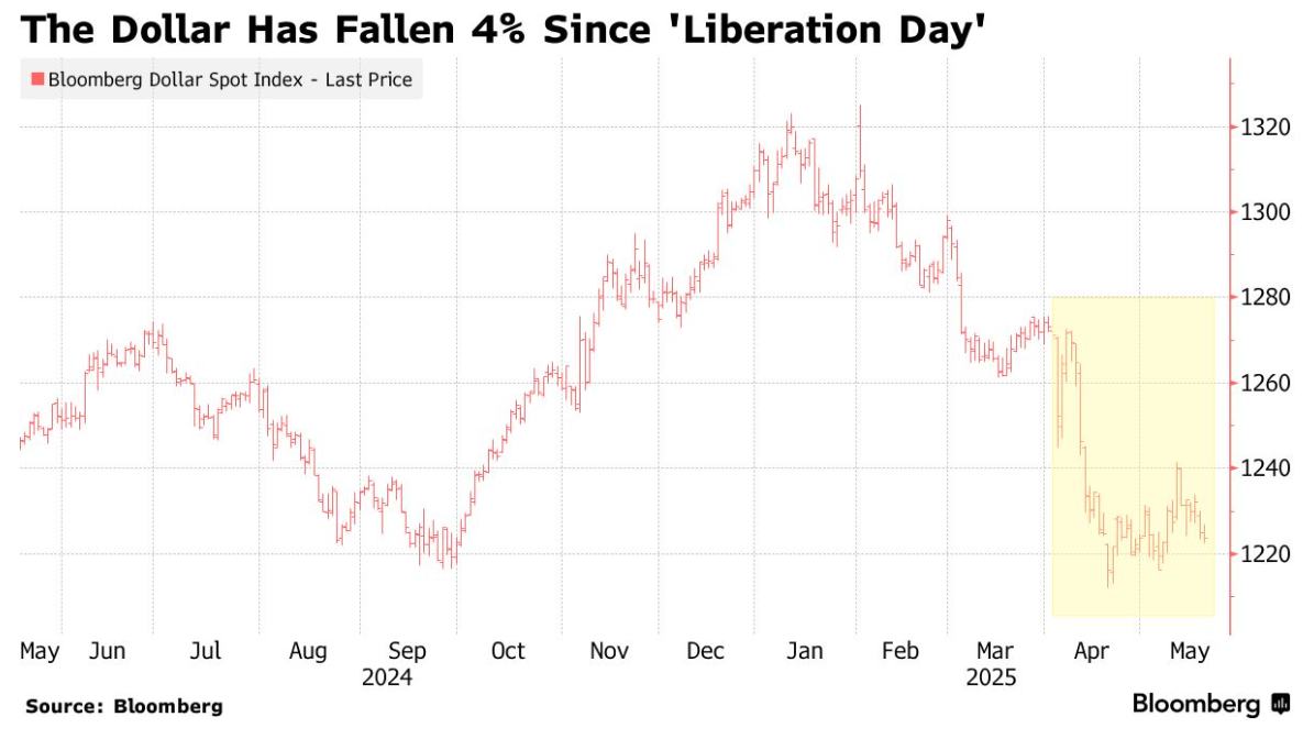 自4月初美国宣布高关税并导致全球市场动荡以来,彭博美元即期指数已下跌4%。此后,混乱的实施过程以及对关税持久性的不确定性引发了对美国政策的质疑,损害了对美元和其他美国资产的信心。